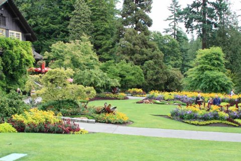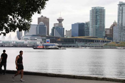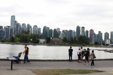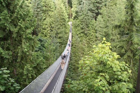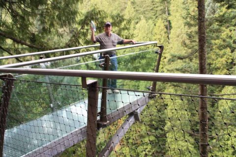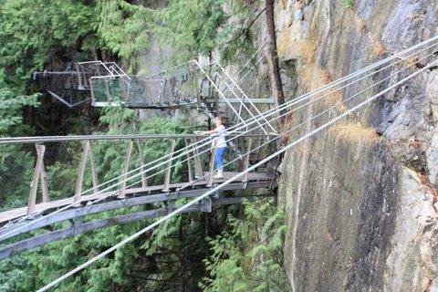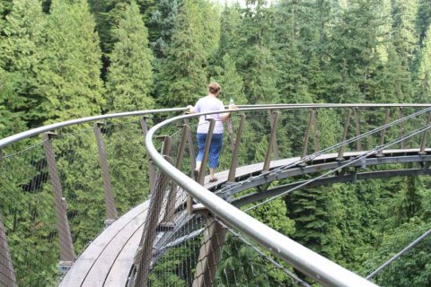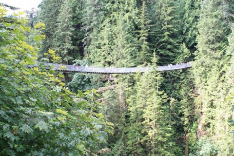 Suspension Bridge - sådan ser den ud  Vi gik endda tilbage igen (det er man nødt til for at komme hjem)  Så er det den nye attraktion Cliffhanger Walk  Det ser værre ud, end det er -  Ud over ingenting - på en glasplade  Lille udsnit af Stanley Park  Byen set fra Stanley Park  Mere by fra Stanley Park siden  Og fra tårnet The Lookout  Og endnu et fraThe Lookout