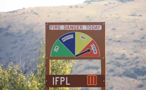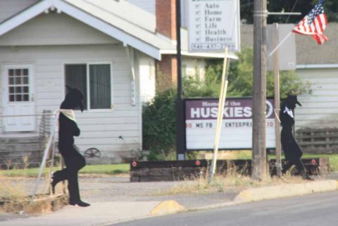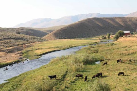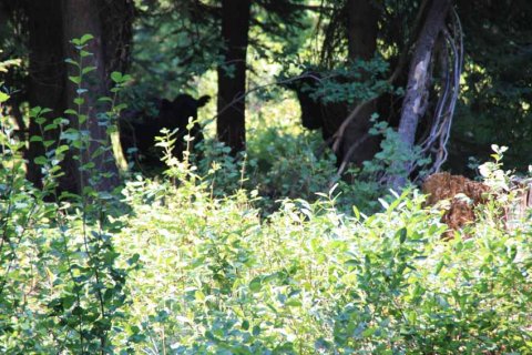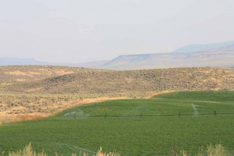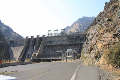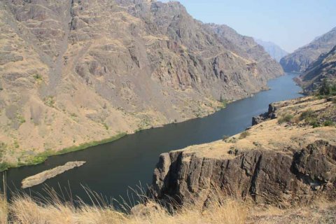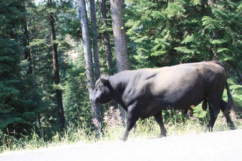 Her slog mange nybyggerne sig ned i Oregon  Så begynder bjergene at dukke op i horisonten  Hvem ville ikke gerne være ko her?  Gadeskilt midt ude i det ødeste ingenting  Sommeren har været meget tør i hele området, så vi ser disse skilte overalt  Endnu et gensyn med Snake River, denne gang i Hells Canyon  Dæmning i Hells Canyon på grænsen mellem Idaho og Oregon  Højt oppe i bjergene så vi pludselig dyr ligge og hvile sig i skovkanten. Vi kunne ikke se, hvilke dyr det var ...  ... før vi så fatter her komme adstadigt gående på vejen  Gadeudsmykning i byen Wallowa