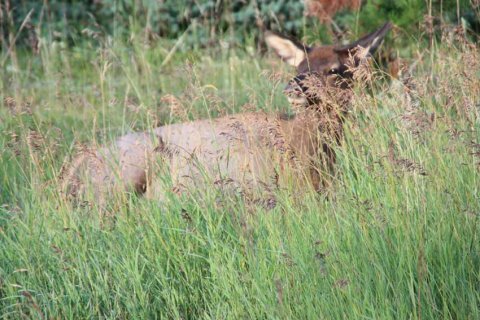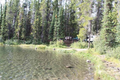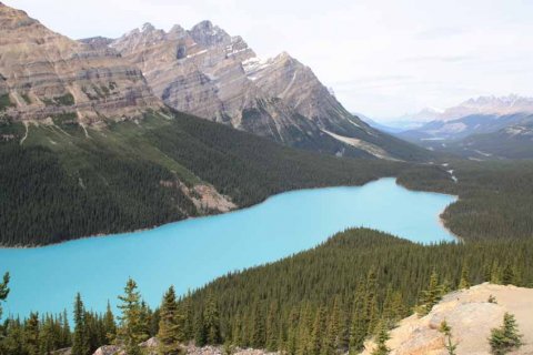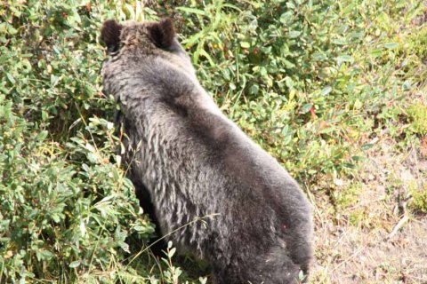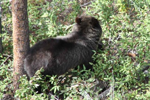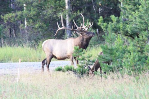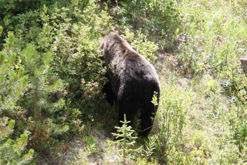 En stolt Wapiti-hjort græsser i vejkanten med sit harem  Det lille kid prøvede at gemme sig  Honeymoon Lake, hvor Helga, Christian og Solveig engang boede  Sådan ser der altså bare ud hele vejen  Den smukkeste af dem alle - Peyto Lake  Den tyvagtige skade - eller noget  På vej op i Lake Louise Gondola  En Columbian Ground Squirrel (jordegern af en slags)  1. grizzlybjørn på vejen op  2. grizzlybjørn på vejen op  3. grizzlybjørn på vejen ned